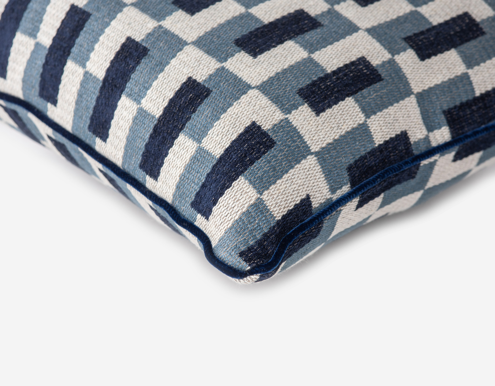Multicoloured geometric texture in cotton and linen, with velvet trimmings.