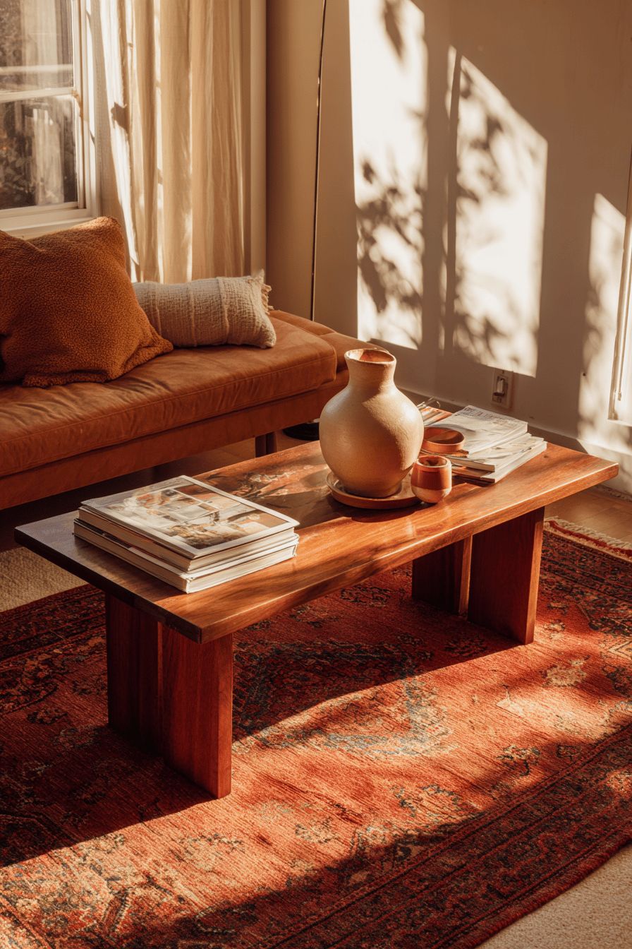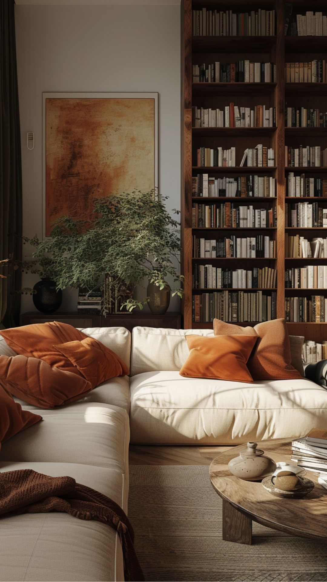 Combinazioni creative: osare mixando diverse texture e tonalità della stessa palette autunnale può creare effetti molto interessanti. Ad esempio, un plaid in cashmere morbido color ruggine sopra un divano con cuscini in lana bordeaux, senape e grigio tortora, con un tappeto neutro come sfondo, dà un senso di stratificazione e comfort senza risultare pesante.