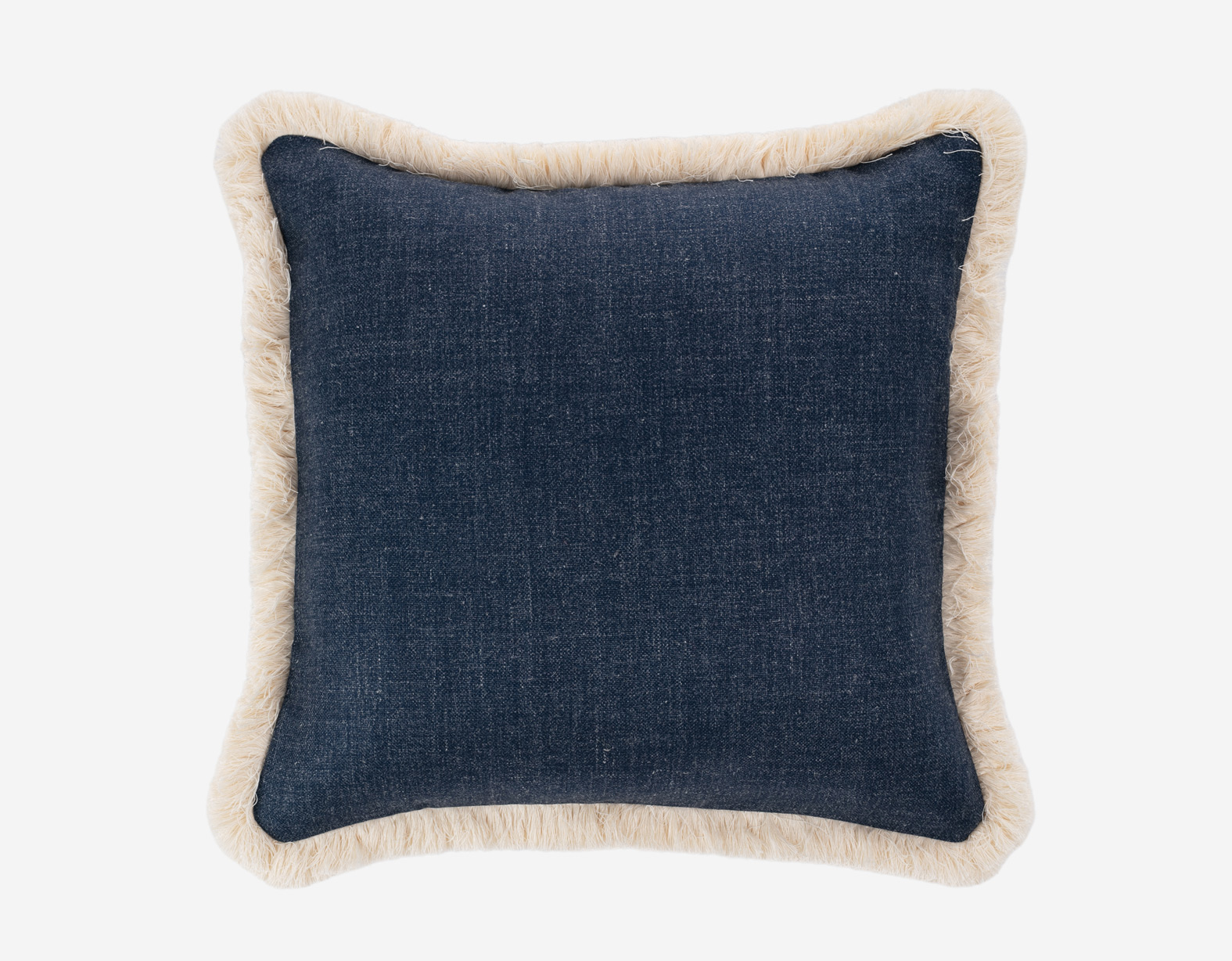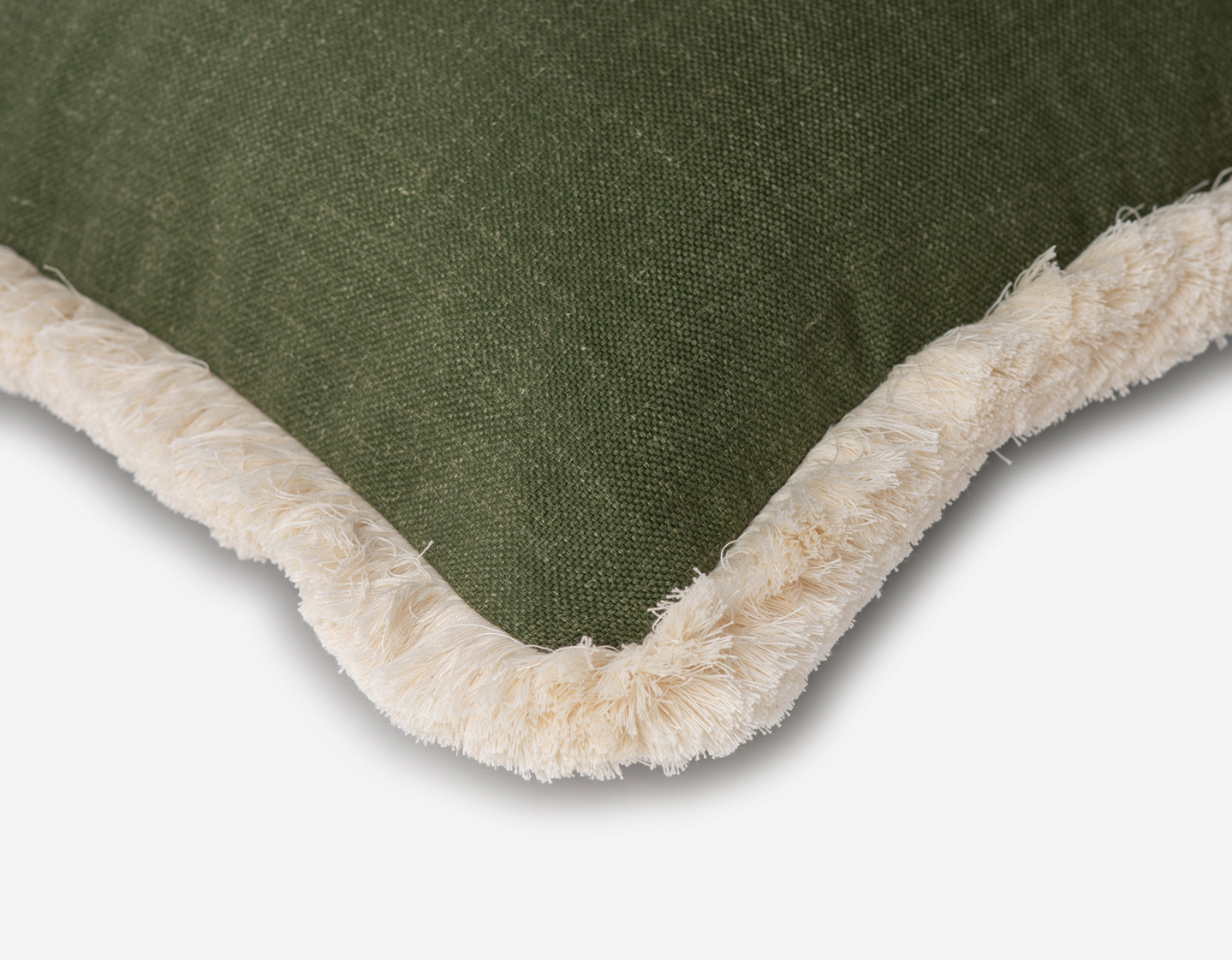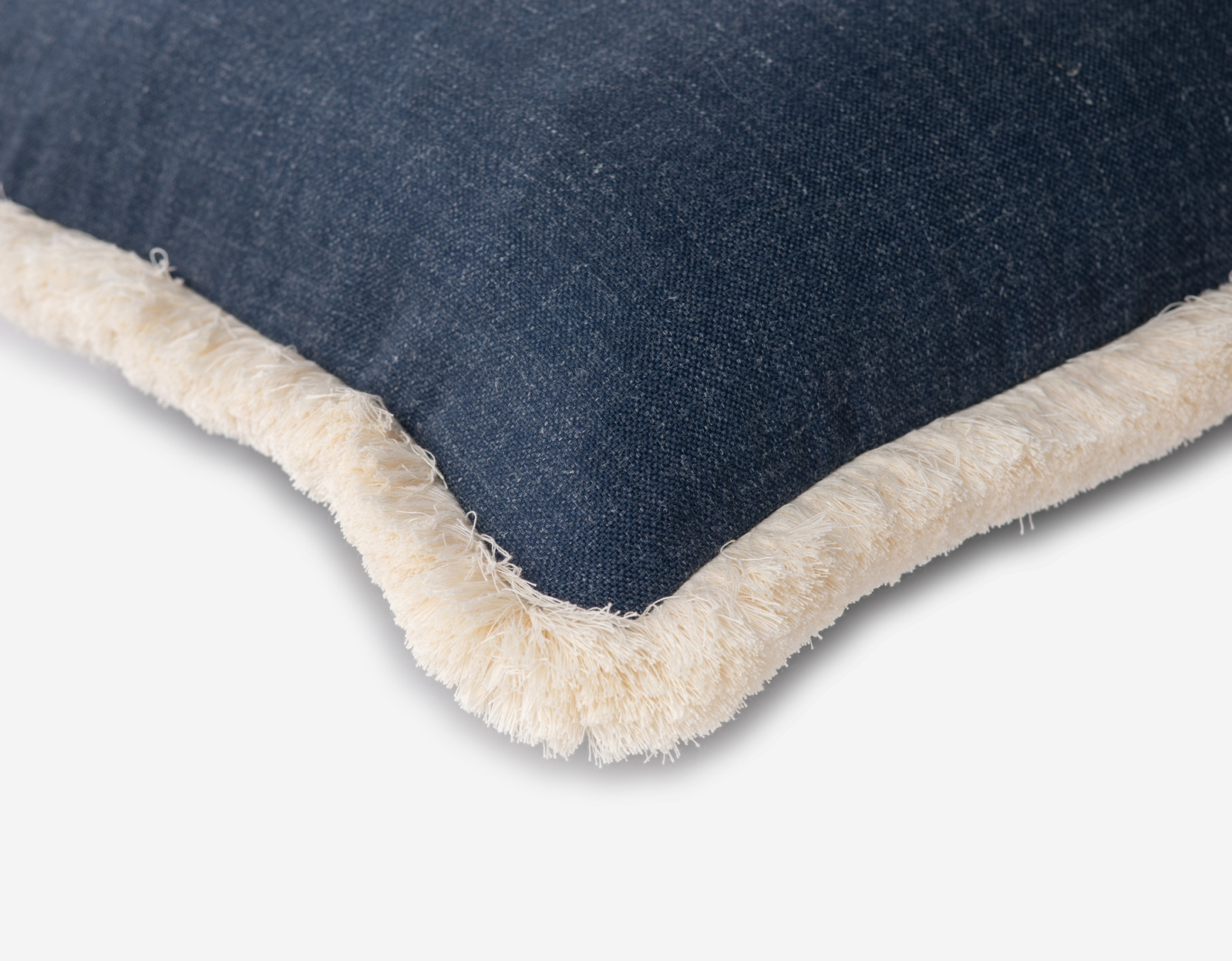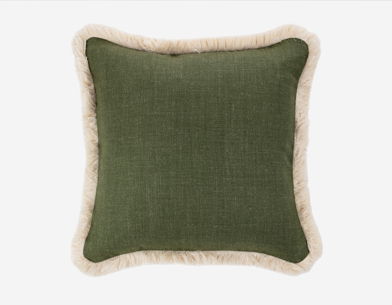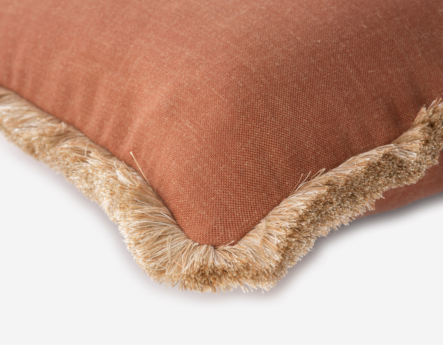 Cuscino unito elegante in lana e lino, contornato da spazzolino di passamaneria.