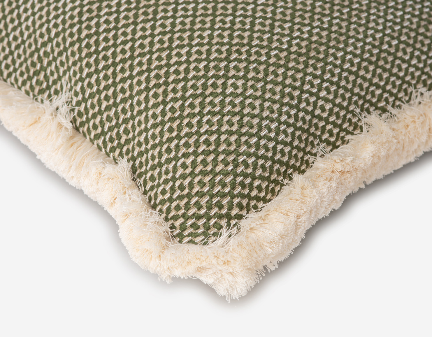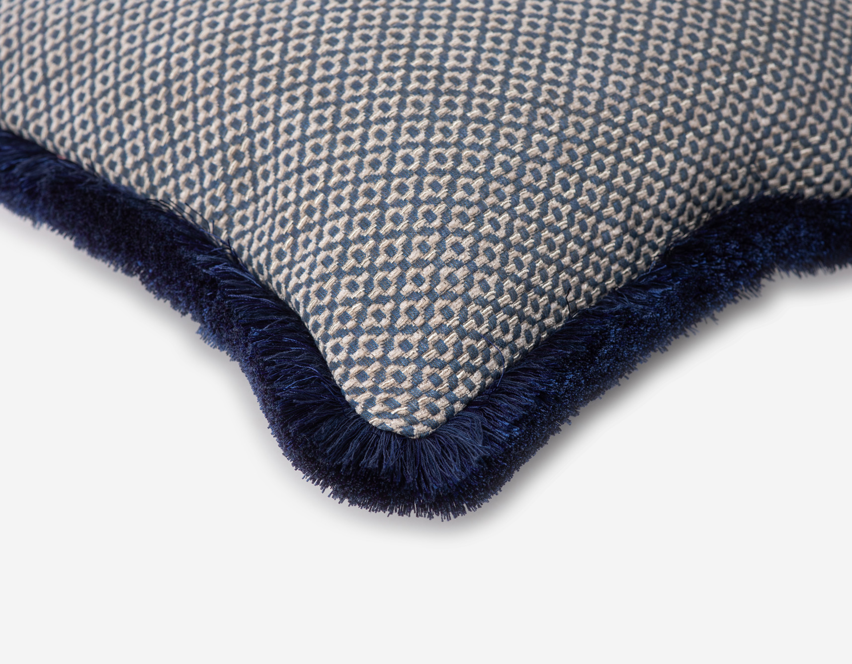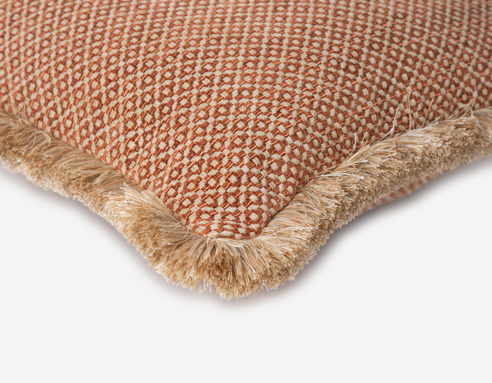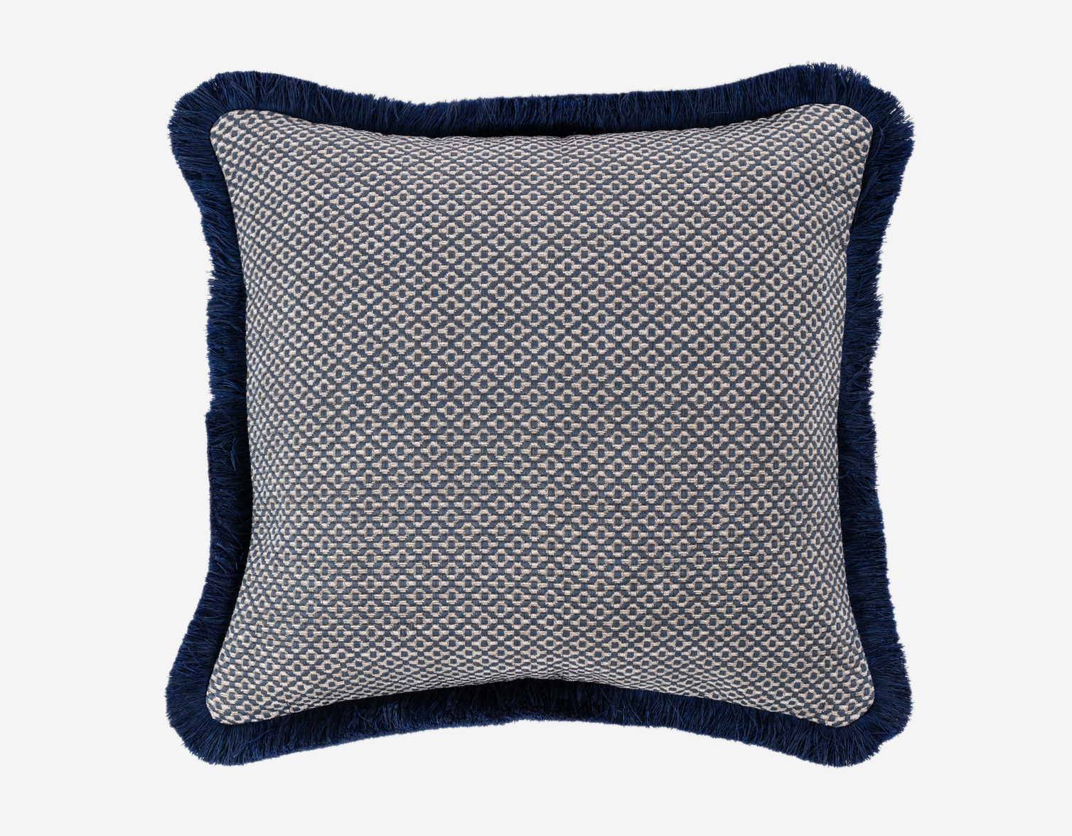 Cuscino disegnato con filo brillante in trama che rende i suoi colori vivaci. Contornato da spazzolone di passamaneria.